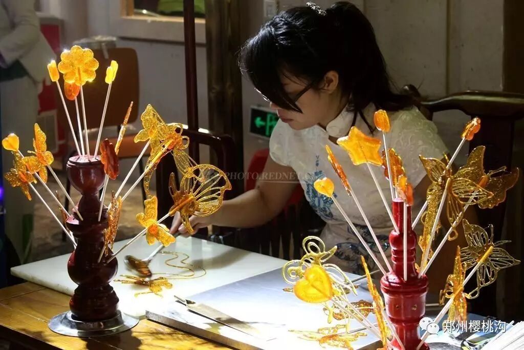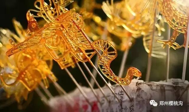 糖画是一种传统民间手工艺,以糖为材料来进行造型的。所用的工具仅一勺一铲,糖料一般是红、白糖加上少许饴糖放在炉子上用温火熬制,熬到可以牵丝时即可以用来浇铸造型了。在绘制造型时,由艺人用小汤勺舀起溶化了的糖汁,在石板上飞快地来回浇铸,画出造型,民间艺人的手上功夫便是造型的关键。