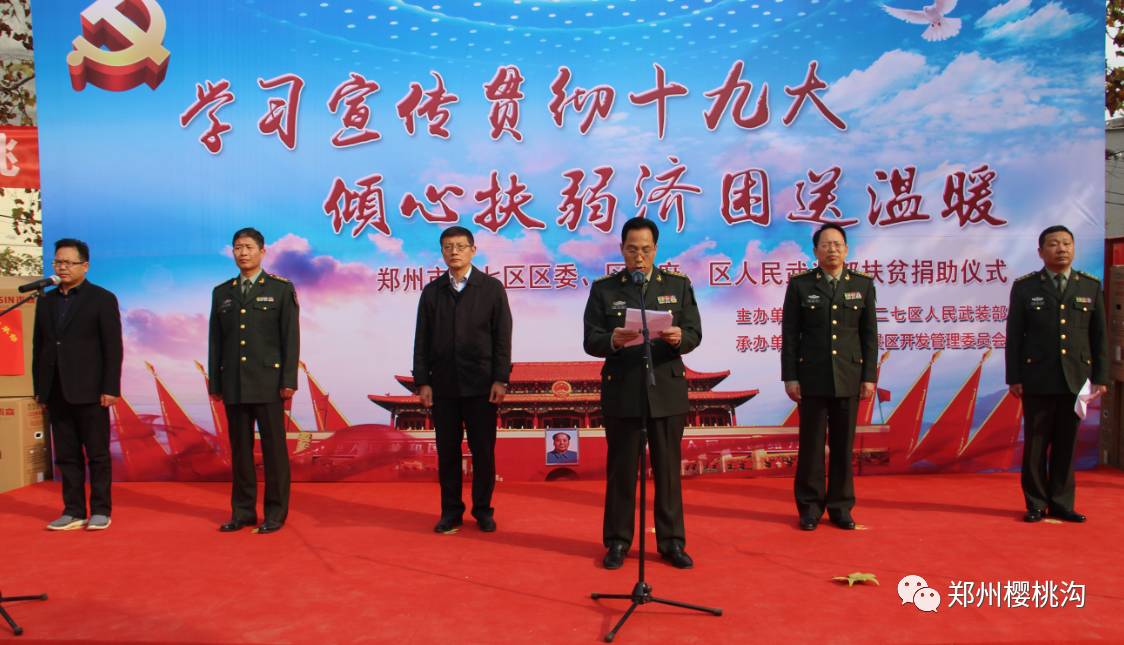 郑州警备区副司令员董继锋在活动仪式上,充分肯定这项活动是党的十九大精神在基层、在乡村的生动实践。他说,在贯彻落实党的十九大精神方面,二七区干在实处、走在前列,做出了表率。党的十九大精神内涵丰富、博大精彩、极端重要,学习宣传贯彻党的十九大精神不是一时一阵的事情,而是一项长期的任务。军队姓军为民,历来把驻地当故乡,把群众当亲人,视驻地的困难为自己的困难,视群众的疾苦为自己的疾苦,为地方经济社会建设发挥自己应有的作用。武装部心中有为民传统,肩上有为民责任,身后有为民期盼,要在完成军事工作任务的同时,大力推进农村脱贫攻坚工作,助力驻地经济社会发展,以实际行动树立好人民军队为人民的良好形象,确保党的十九大精神落地生根,为郑州市提前全面建成小康社会做出更大贡献。