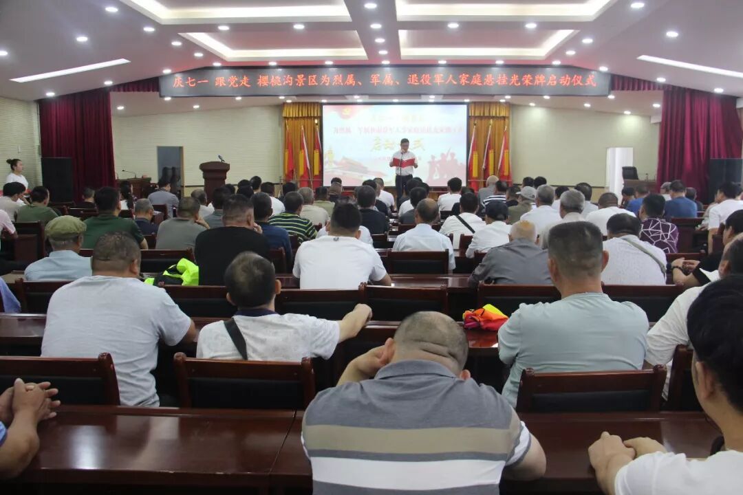 2019年七一来临之际,为热烈庆祝中国共产党建党98周年和中华人民共和国成立70周年,贯彻落实中央关于为烈属、军属和退役军人等家庭悬挂光荣牌的重要决策部署,体现党组织的关怀和温暖,6月20日上午,樱桃沟景区举办“庆七一、跟党走”为军属和退役军人家庭悬挂光荣牌启动仪式。樱桃沟景区党工委书记徐建、副书记叶磊出席本次挂牌仪式,仪式由景区党工委委员、副主任宗献伟主持,各社区两委主要负责同志及退役军人服务联络员、辖区烈属、军属、退役军人等家庭代表和辖区各界人士近300人参加了仪式。